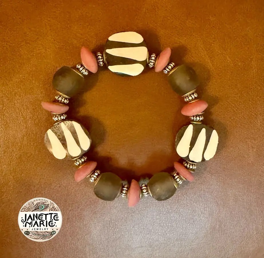 Chocolate, pink, black and bone beads with copper and silver spacers! Don’t be afraid of bold designs and colors.