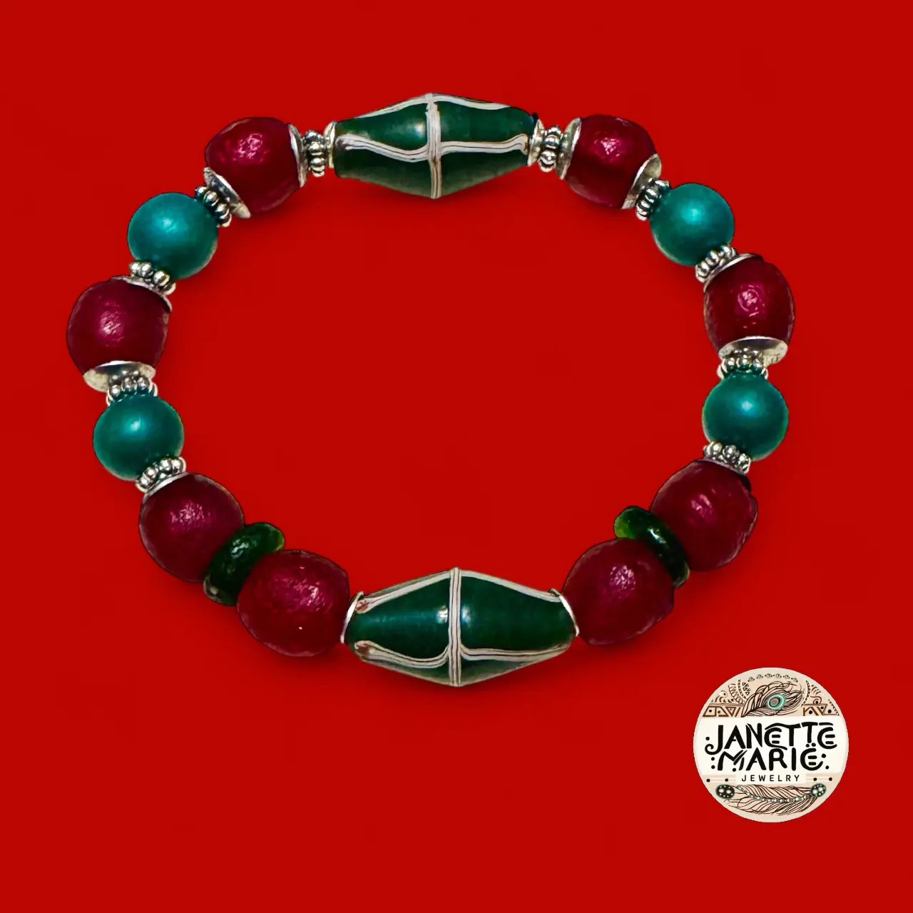 This elegant bracelet celebrates fall colors and textures. It’s perfect for any outfit and tells a story. African glass handmade French Cross beads along with a variety of rich green and red handmade glass beads.