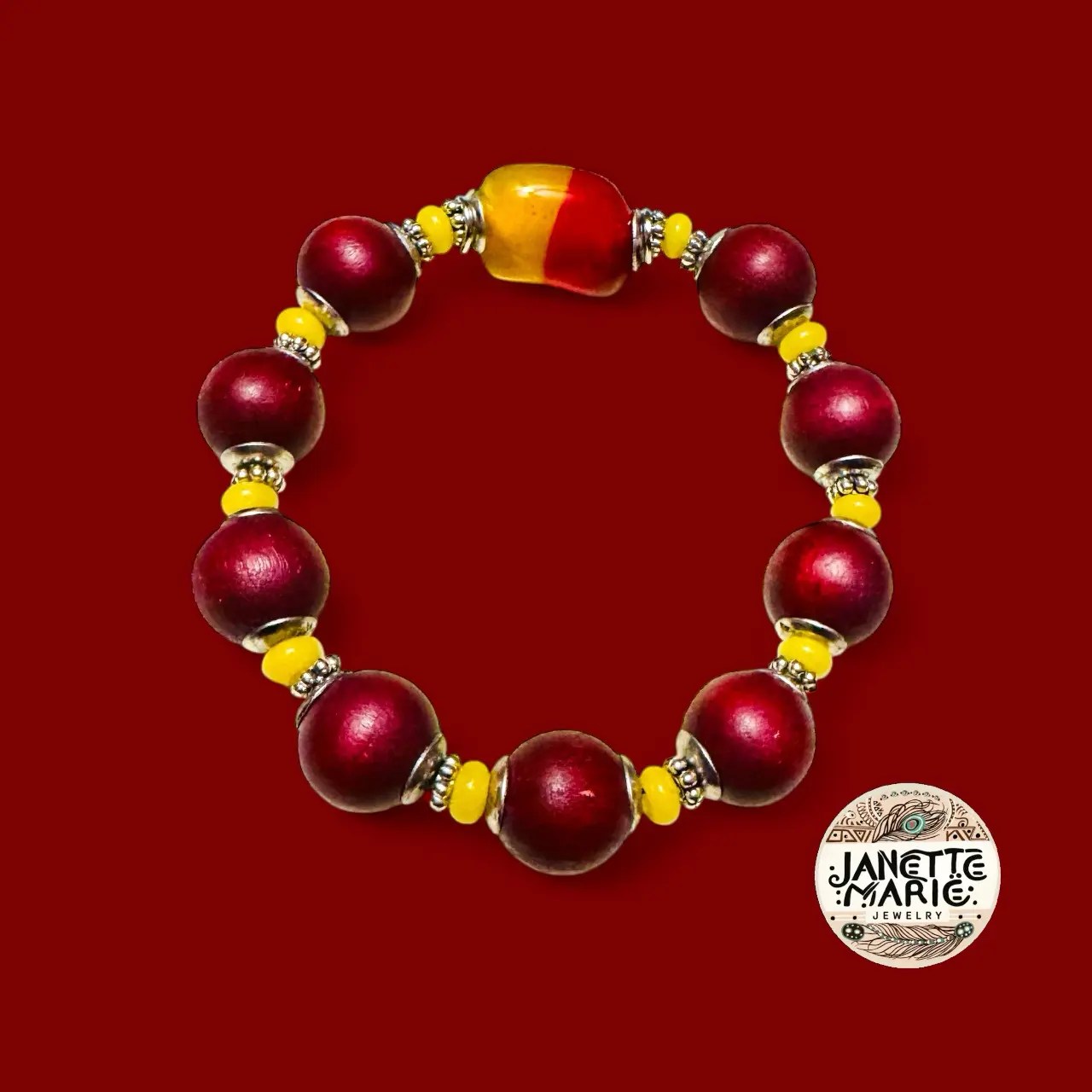 This elegant bracelet is a lively celebration of color and texture, perfect for adding a touch of elegance to any outfit with round wooden beads in rich red, along with vibrant, African recycled glass beads in warm yellow and decorative silver spacers. This eclectic mix adds visual interest and depth to the design.